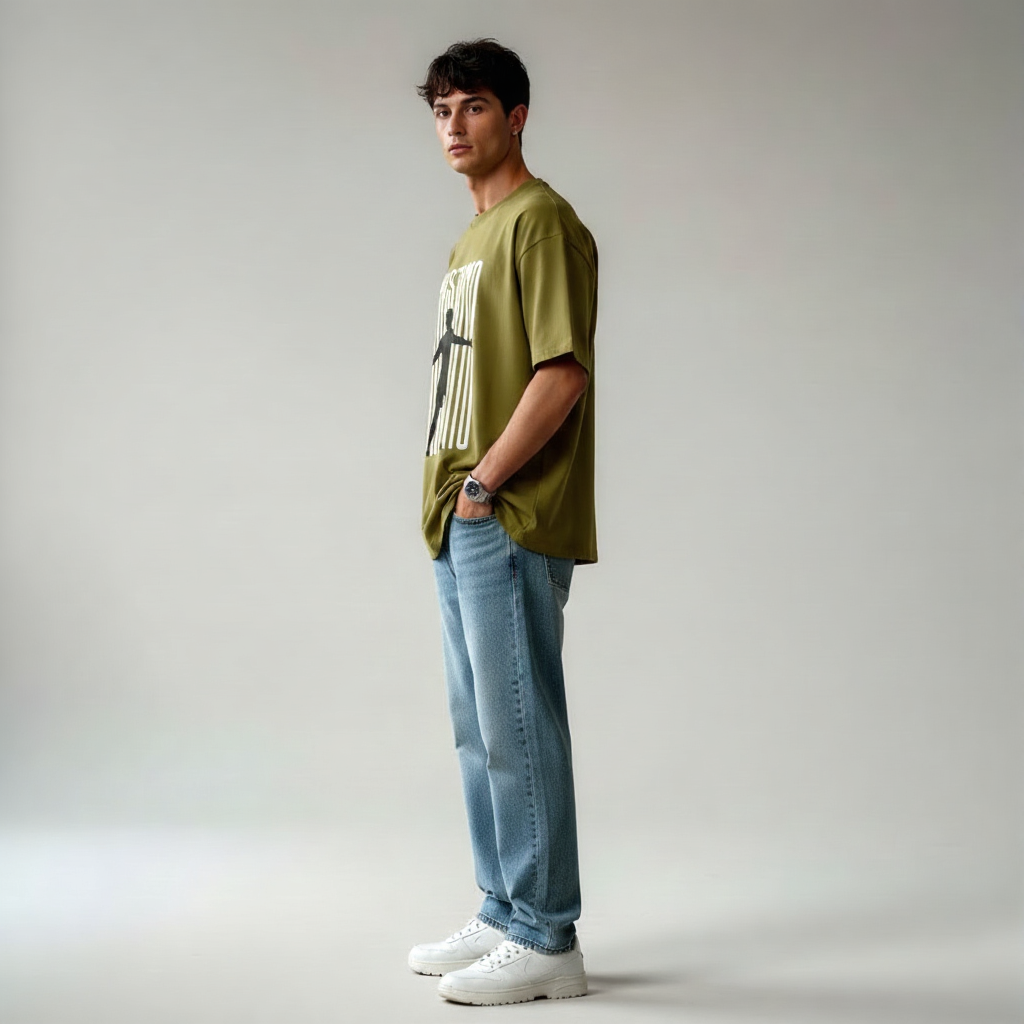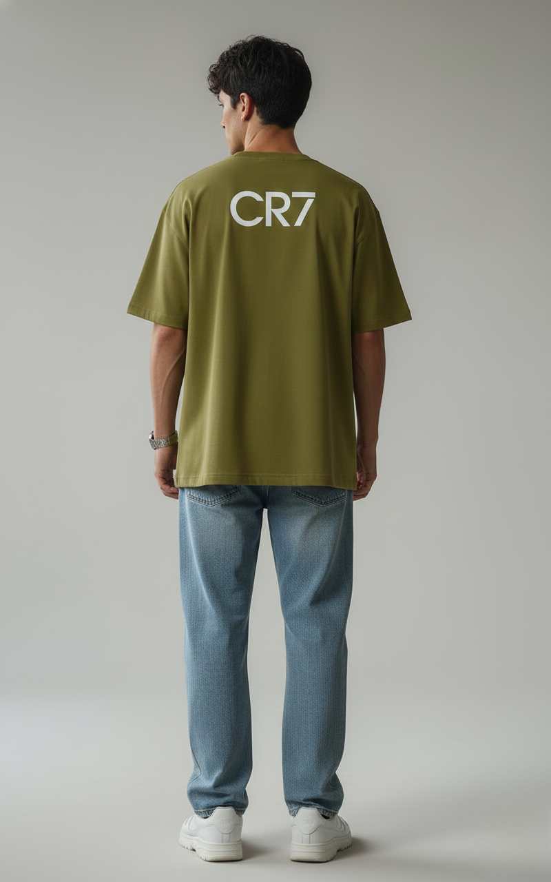 Elevate your streetwear game with the CRISTIANO Silhouette Oversized T-Shirt, a clean and modern statement piece designed for fans of sporty, minimalist fashion. This olive-green tee showcases a striking silhouette graphic framed by tall vertical typography that reads “CRISTIANO,” creating a powerful visual that blends athletic energy with contemporary design.